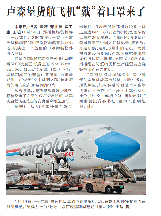 這是盧森堡貨航降落在鄭州機場的第5000次航班,機身上的“NotWith-outMyMask”(沒戴口罩可不行)字樣和亮眼的藍色口罩圖案,宣示著鄭州—盧森堡“空中絲綢之路”抗擊疫情的決心和連通保供的擔(dān)當(dāng)。